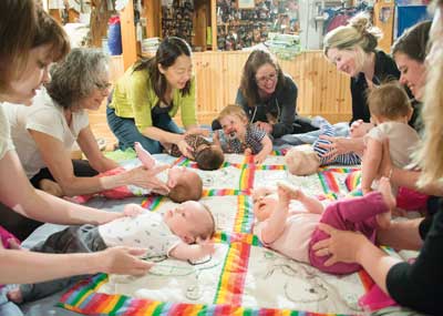 Stein’s “Baby and You” classes begin with a lullaby to bring the group together, and then include a variety of gentle, slow-paced activities that both stimulate and calm the babies. “It’s about working on the brain-body connection,” explained Stein. “The size of babies’ brains doubles in the first year, so anything we can do to develop those neurological pathways is beneficial.” These classes are based on the Nurturing Pathways program, a research-based curriculum aimed at promoting healthy development of babies’ bodies and brains and at strengthening the connection between babies and the people who love them. Babies will bounce on exercise balls, take bedsheet rides, and enjoy folk dances, waltzes, massage, and Mother Goose rhymes with the help of their caregivers. “The goal is to use music, movement, touch, and interpersonal connection to stimulate the babies’ brains and to have fun together,” explained Stein. For these youngest children, Stein focuses on songs that caregivers can incorporate into daily routines. “We might learn a song that can go along with diapering or dressing,” said Stein. “We find opportunities to bring music and body movement into the tasks that happen often and are often a bit mundane. They don’t have to be! They can always pick up a baby and dance. A baby — or a parent — can be cranky and then you put on a favorite piece of music and everything feels better.” Stein said that one mom recently told her that these classes “remind her that there is still peace and calm in this world.” To keep the focus on the babies, older siblings are not invited to the “Baby and You” classes.