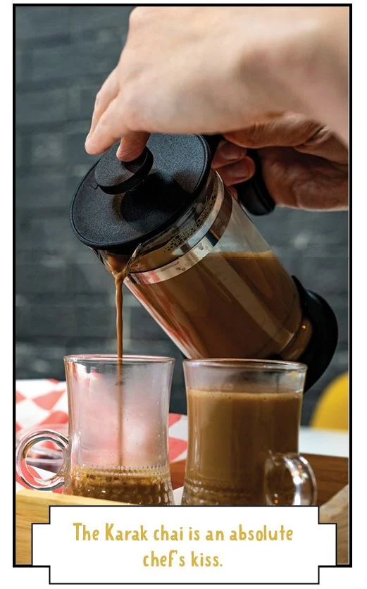 If you don’t like milk in your tea (normally I don’t), there are also green and black tea options. But the Karak chai is an absolute chef’s kiss. You can order it with or without sugar. Other chais on the menu are Amore, with notes of vanilla; Bonbon, with notes of caramel, cinnamon, and ginger; and the Sulaimani, a black tea with lemon and herbs. You can also order a dirty chai (tea and coffee) or the Karak coffee, which I think I would like more if tea weren’t the better beverage. (My husband is a diehard coffee drinker and he enjoyed the dirty chai.) Other beverages include mango lassi, masala soda, iced tea lemonade, a list of enticing mocktails, and so much more. But I have to stop writing about drinks because we need to get to the phenomenal food!