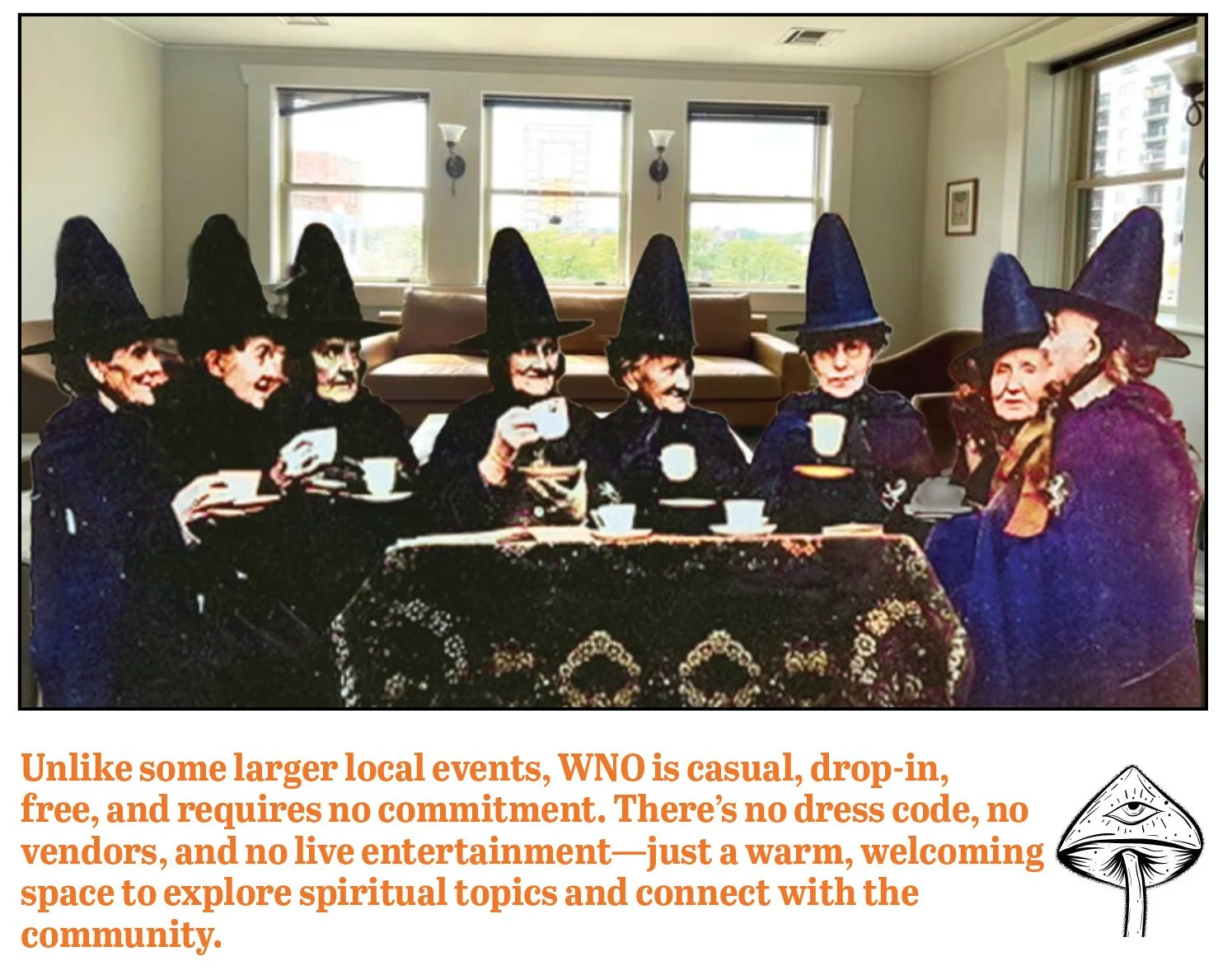 Unlike some larger local events, WNO is casual, drop-in, free, and requires no commitment. There’s no dress code, no vendors, and no live entertainment—just a warm, welcoming space to explore spiritual topics and connect with the community. “Relaxed” is the word Finkle used to describe the atmosphere. Each meeting includes informal chats and open-ended discussion over cookies to cultivate a judgment-free zone for learning and growth in whatever phase of spirituality one may be in.
