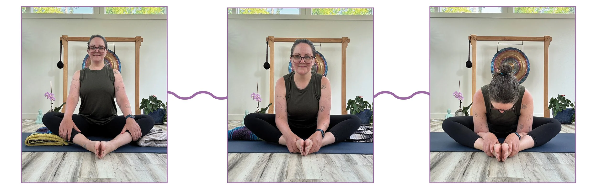 To come into Baddha Konasana, we can be elevated on a blanket or bolster if that assists the elongation of the spine. Extending the legs out in front of the body, we can externally rotate the legs, so the inside of the thighs are moving skyward. We start to move the soles of the feet together. In the images above, my feet are touching. They do not have to touch. There are times when I leave a few inches between the soles of the feet. In two of the images, I am using blankets under the thighs to allow a softer release through the hips. If blocks or bolsters are a more comfortable height, use those! In one image, I am also adding in a forward fold, without blankets. All of these are choices and are based on the moment. If adding something feels good, add it and breathe into the space. If taking away a prop feels good, take it away and breathe into that space. The beauty of Baddha Konasana is that we can sit for a few minutes while watching TV or take a break from the computer for a few minutes and sit in the pose. Take a minute to allow a bit of ease into the day and into the body.