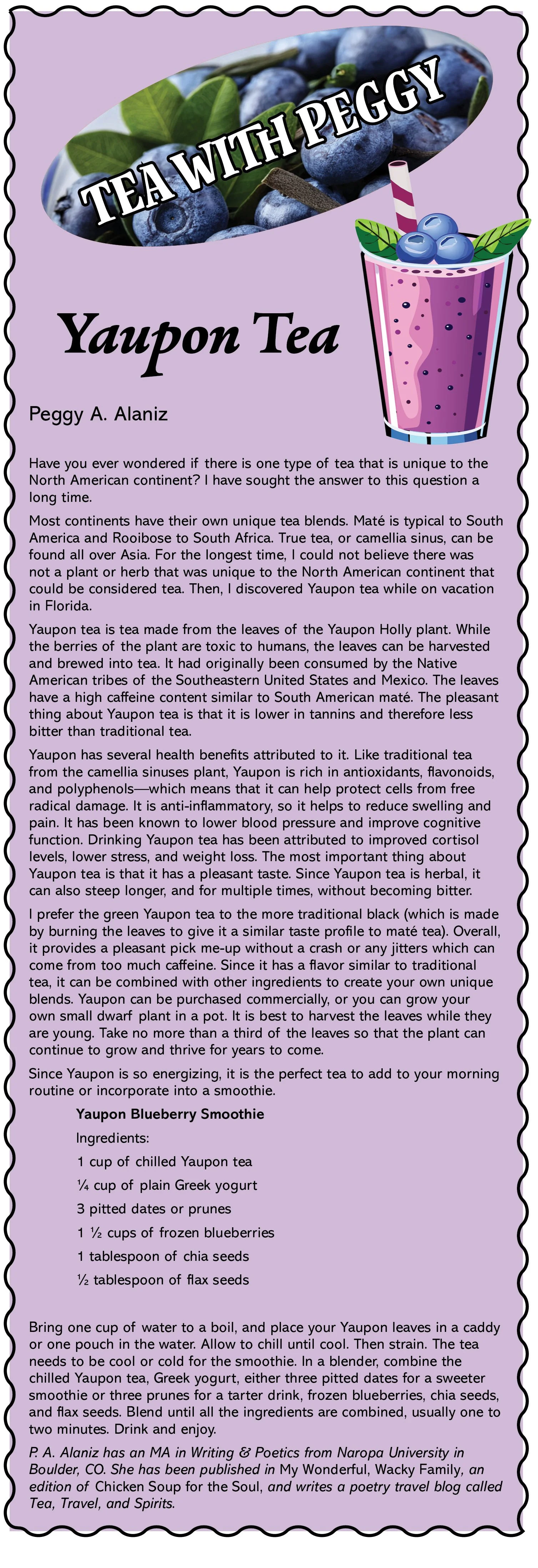 Tea with Peggy--Yaupon Tea Posted on September 1, 2025 by Peggy Alaniz and filed under Columns, Food & Nutrition, Food Section, Issue #90 and tagged Tea tea time with Peggy tea column food and nutrition.